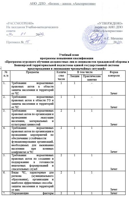 Учебная программа курса составлена на основе примерной программы курсового обучения должностных лиц и работников гражданской обороны и единой государственной системы предупреждения и ликвидации чрезвычайных ситуаций, утвержденной Министром Российской Федерации по делам гражданской обороны, чрезвычайным ситуациям и ликвидации последствий стихийных бедствий 22.02.2017.