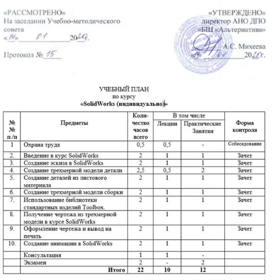 Целью курса обучения является приобретение обучающимися теоретических и практических знаний, а также навыков работы в программе SolidWorks. В рамках курса рассматриваются инструментальные средства создания конструкторской документации (чертежи, схемы, спецификации) SolidWorks, приемы оформления чертежа согласно ЕСКД, настройка системы; создание параметрических графических объектов, принципы создания и использования библиотек типовых элементов; создание пользовательских элементов оформления: основные надписи, стили линий, шаблоны предопределенных текстов и технических требований; создание текстовых документов, таблиц изменений.