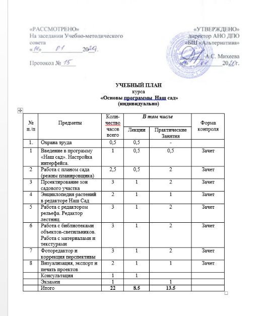 По окончании курсов учащийся должен знать программу Наш сад как инструмент создания, проекта зон садового участка. Уметь работать с планом сада, пользоваться энциклопедией растений в редакторе Наш сад, работать с редактором рельефа, с библиотеками объектов, проектировать зоны садового участка.очная
