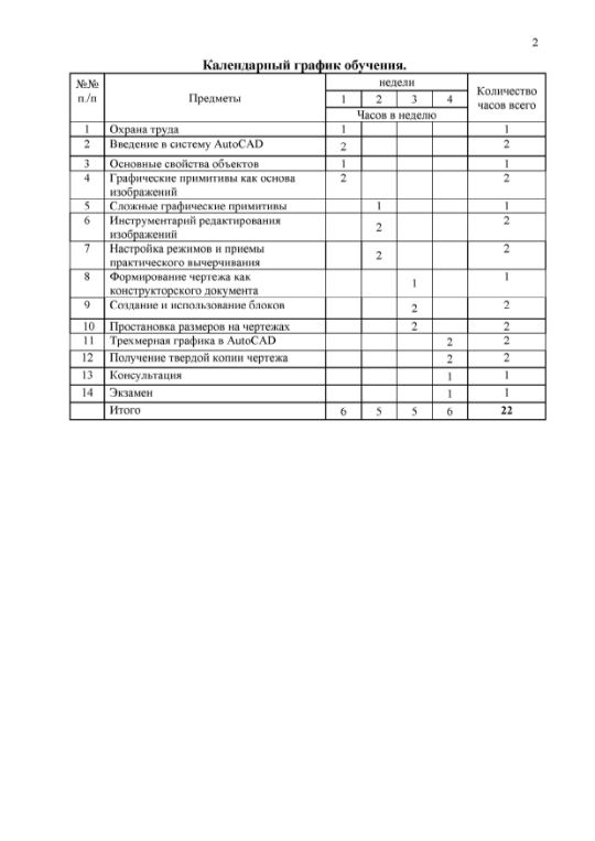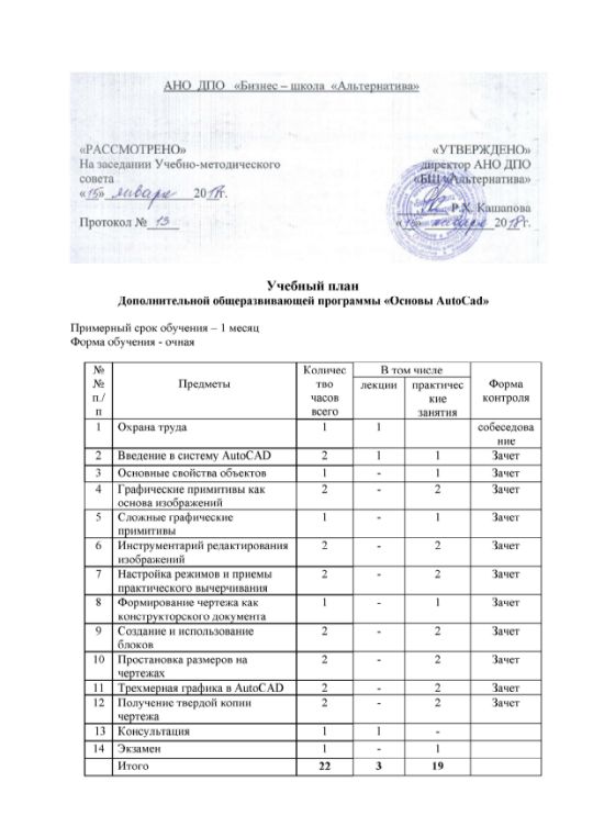 Целью курса обучения является – приобретение обучающимися теоретических и практических знаний, а также навыков работы в программе Автокад. В рамках курса рассматриваются инструментальные средства создания конструкторской документации (чертежи, схемы, спецификации), приемы оформления чертежа согласно ЕСКД, настройка системы; создание параметрических графических объектов, принципы создания и использования библиотек типовых элементов; создание пользовательских элементов оформления: основные надписи, стили линий, шаблоны предопределенных текстов и технических требований; создание текстовых документов, таблиц изменений.