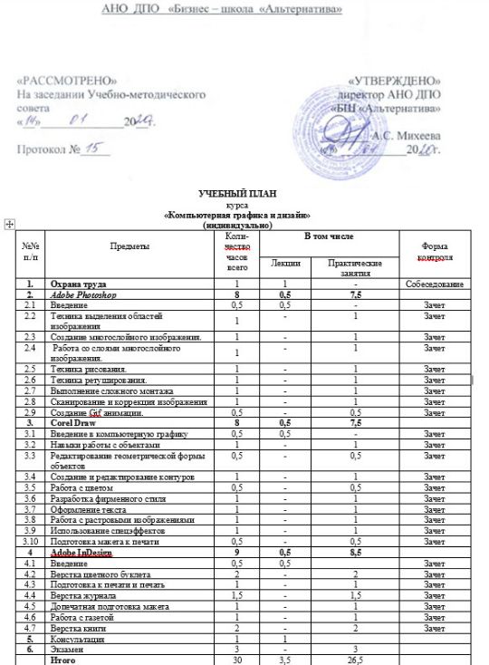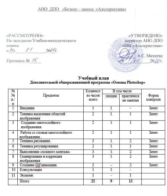 К концу обучения каждый обучаемый должен уметь самостоятельно выполнять все работы, предусмотренные учебным планом, такие как создание, редактирования, ретушь, цвето-коррекция фотографических изображений, создание Gig-анимации