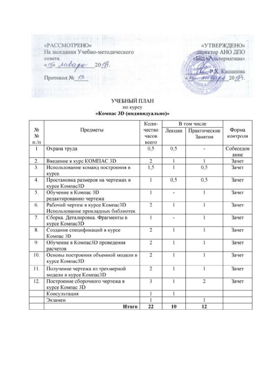 Целью курса обучения является– приобретение обучающимися теоретических и практических знаний, а также навыков работы в программе Компас 3D. В рамках курса рассматриваются инструментальные средства создания конструкторской документации (чертежи, схемы, спецификации) КОМПАС 3D, приемы оформления чертежа согласно ЕСКД, настройка системы; создание параметрических графических объектов, принципы создания и использования библиотек типовых элементов; создание пользовательских элементов оформления: основные надписи, стили линий, шаблоны предопределенных текстов и технических требований; создание текстовых документов, таблиц изменений.