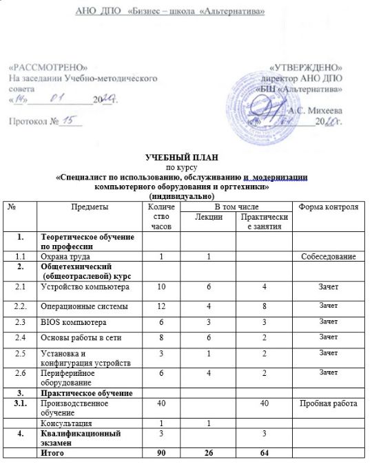 Программой предусмотрено изучение основных возможностей сборки, настройки и использования ПК, а также подключения к нему различных периферийных устройств. К концу обучения каждый слушатель курса должен уметь самостоятельно осуществлять сборку – разборку ПК. Изменять его конфигурацию в соответствии с поставленным заданием; подключать к компьютеру различные периферийные устройства: принтеры, сканеры; устанавливать различные операционные системы; использовать всевозможные программные диагностические средства для определения устройств, входящих в состав системного блока; утилит для устранения неисправностей и ошибок при загрузке операционной системы; работать с современной оргтехникой, устанавливать антивирусное ПО и работать с ним.