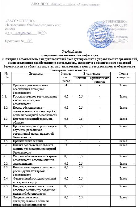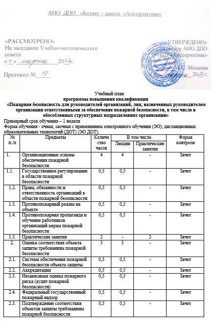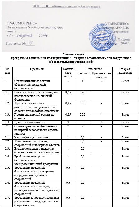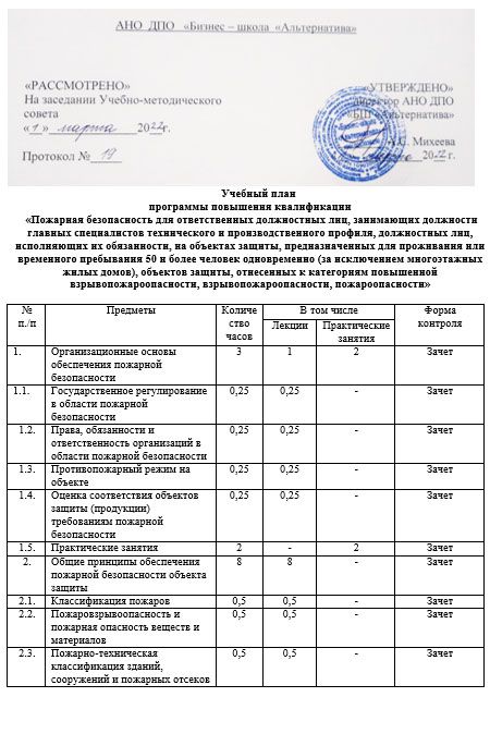 Учебная программа курса составлена на основе типовой дополнительной профессиональной программы повышения квалификации для руководителей организаций, лиц, назначенных руководителем организации ответственными за обеспечение пожарной безопасности, в том числе в обособленных структурных подразделениях организации, утвержденной